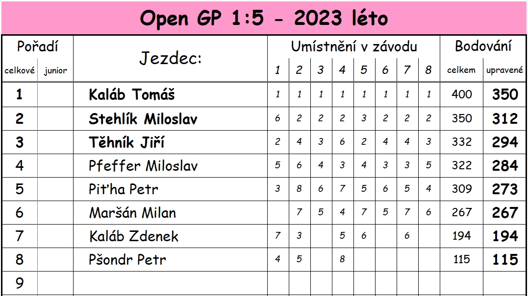 Open GP – plánované poslední, osmé závody, nakonec nebyly posledními, protože už na sedmých závodech jsme avizovali jeden náhradní termín, abychom nahradily propršené soboty. Abychom maximálně využili počasí, kromě standardních osmých závodů a náhradních závodů na přelomu září a října, přidali jsme si my pětináři ještě jeden závodní den, a to ve čtvrtek na den svatého Václava. Protože jsme využili i možnosti dvojzávodu, podařila se nám kompletně dohnat celá sezóna, a nakonec jsme celý rok ukončili odjetím všech plánovaných závodů. Smůlu měl bohužel Zdenek Kaláb, který poslední závody neabsolvoval, protože byl tou dobou již na dovolené v Africe. Díky posledním závodům mu tak chyběly do hodnocení celkem tři finálové jízdy, a to ho stálo celkové umístění v našem poháru, protože mu tak chyběly body do hodnocení. Jeho syn Tomáš ukončil celou sezónu s velice fádním výsledkem, protože na všech našich závodech skončil na prvním místě. Celkové výsledky poháru Open GP si můžete v excelu stáhnout zde na tomto odkazu, a jen pro přehlednost je ještě uvádím i zde do textu: